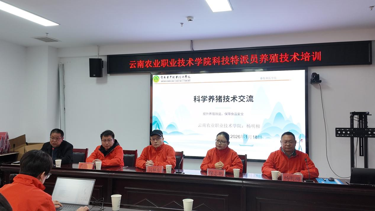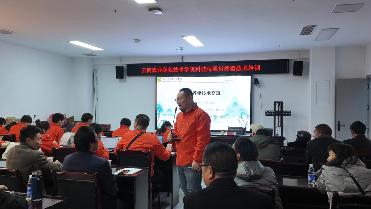 1月18日上午,团队在鲁甸县开展科学养猪和养鸡技术培训,44位养殖户参训。鲁甸县农业农村局副局长高礼银,学院党总支书记保志鹏、院长钱林东出席并讲话,双师型教师杨明柳、简宗辉担任主讲。