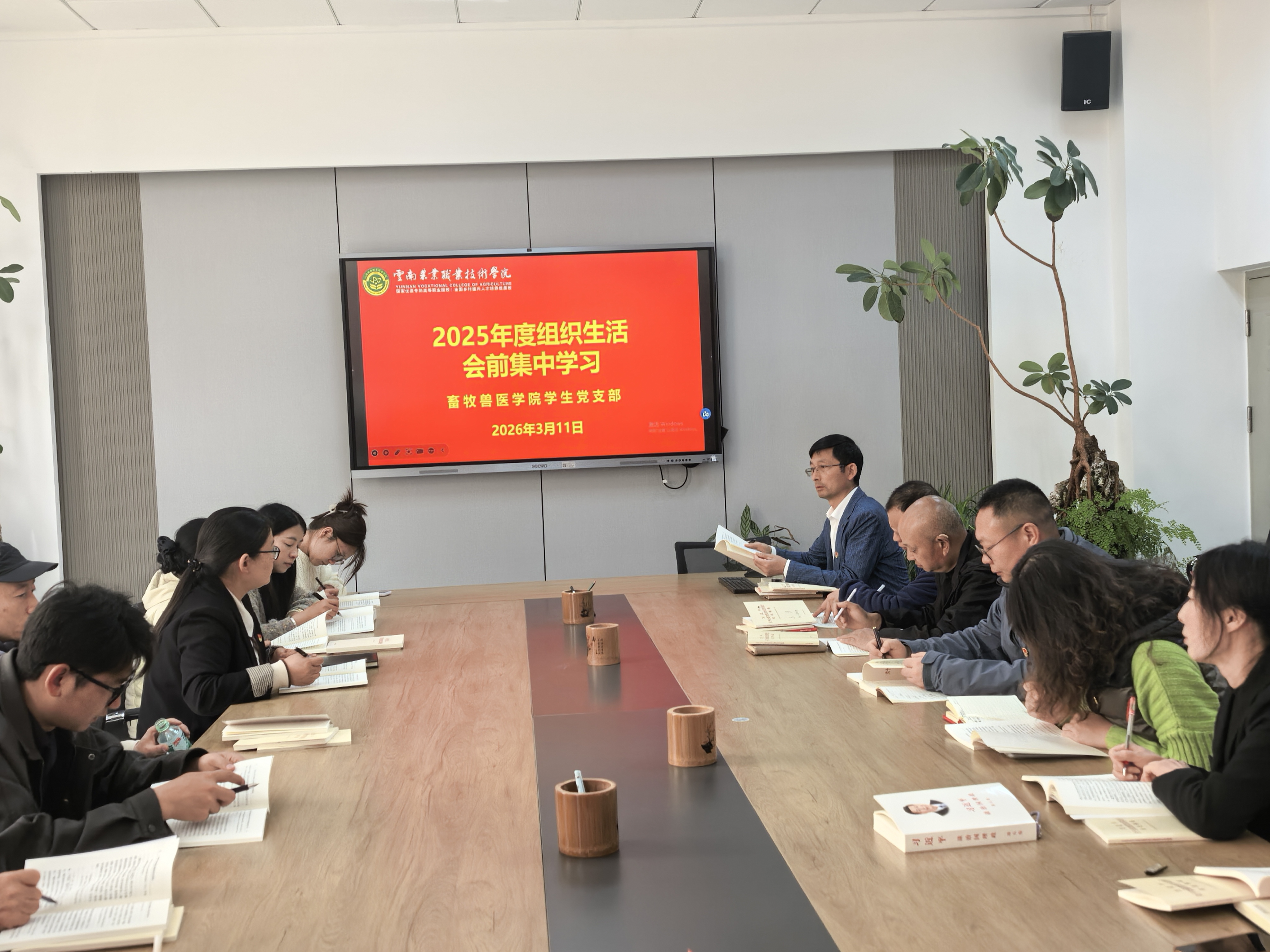 党团建设为深入学习贯彻习近平新时代中国特色社会主义思想,打牢开好 2025 年度组织生活会的思想基础,2026年3 月11 日,畜牧兽医学院学生党支部在综合楼 117 会议室召开会前集中学习会,全体党员同志佩戴党徽参会,认真开展理论学习和交流研讨,党支部书记荀来武同志主持学习并领学。党总支书记保志鹏同志到会指导。