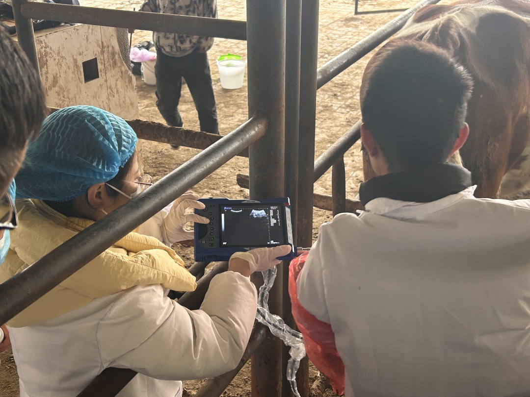 午后,团队在牛舍内开展妊娠诊断技术专题学习。在技术人员指导下,同学们系统学习了B超妊娠监测技术,通过影像识别早期妊娠特征。随后,团队学习了市售妊娠试纸的使用方法,并对采集的全血样本进行处理与检测。技术人员对比讲解了不同诊断方法的原理与判读要点。同学们将今日采集的血样低温保存,后续将用于相关对比研究。基于实践所学,团队还结合自主研发思路进行了简短讨论。